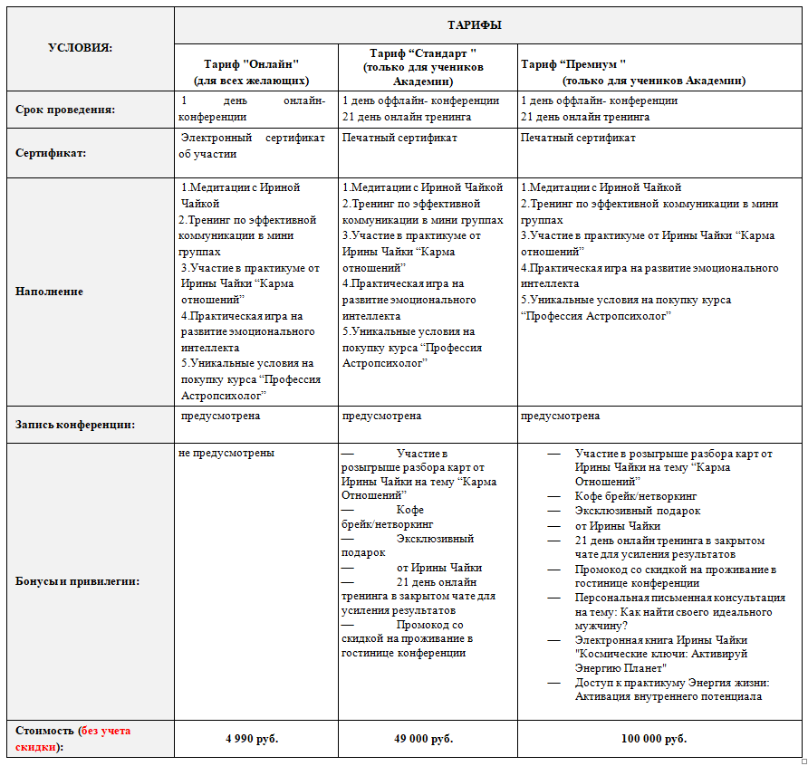 4.1. Настоящей Офертой предусмотрены различные тарифы в зависимости от выбранной Заказчиком программы участия в мероприятии, стоимость которых указана в Приложениях к настоящей Оферте, а также на официальном сайте Исполнителя.